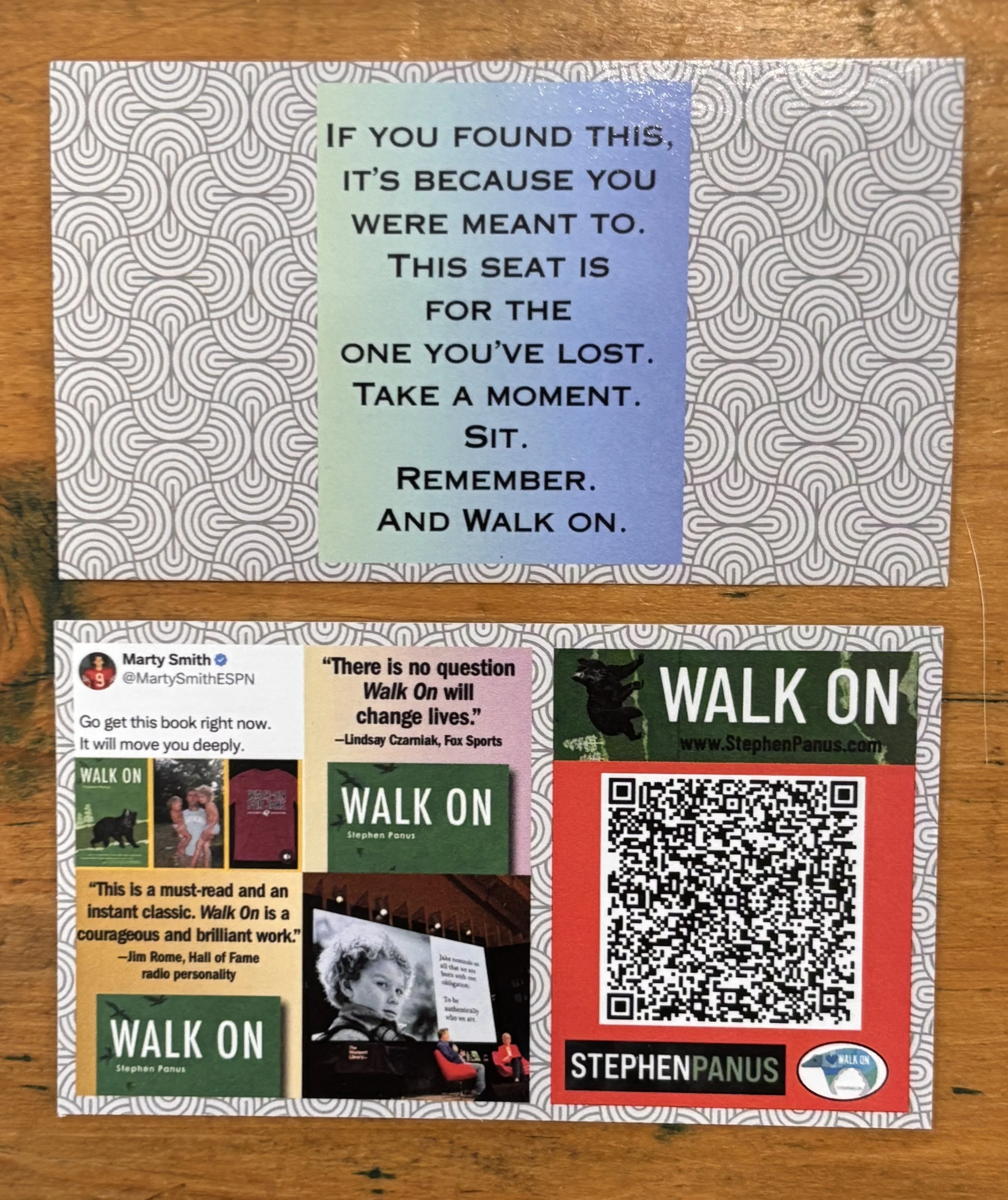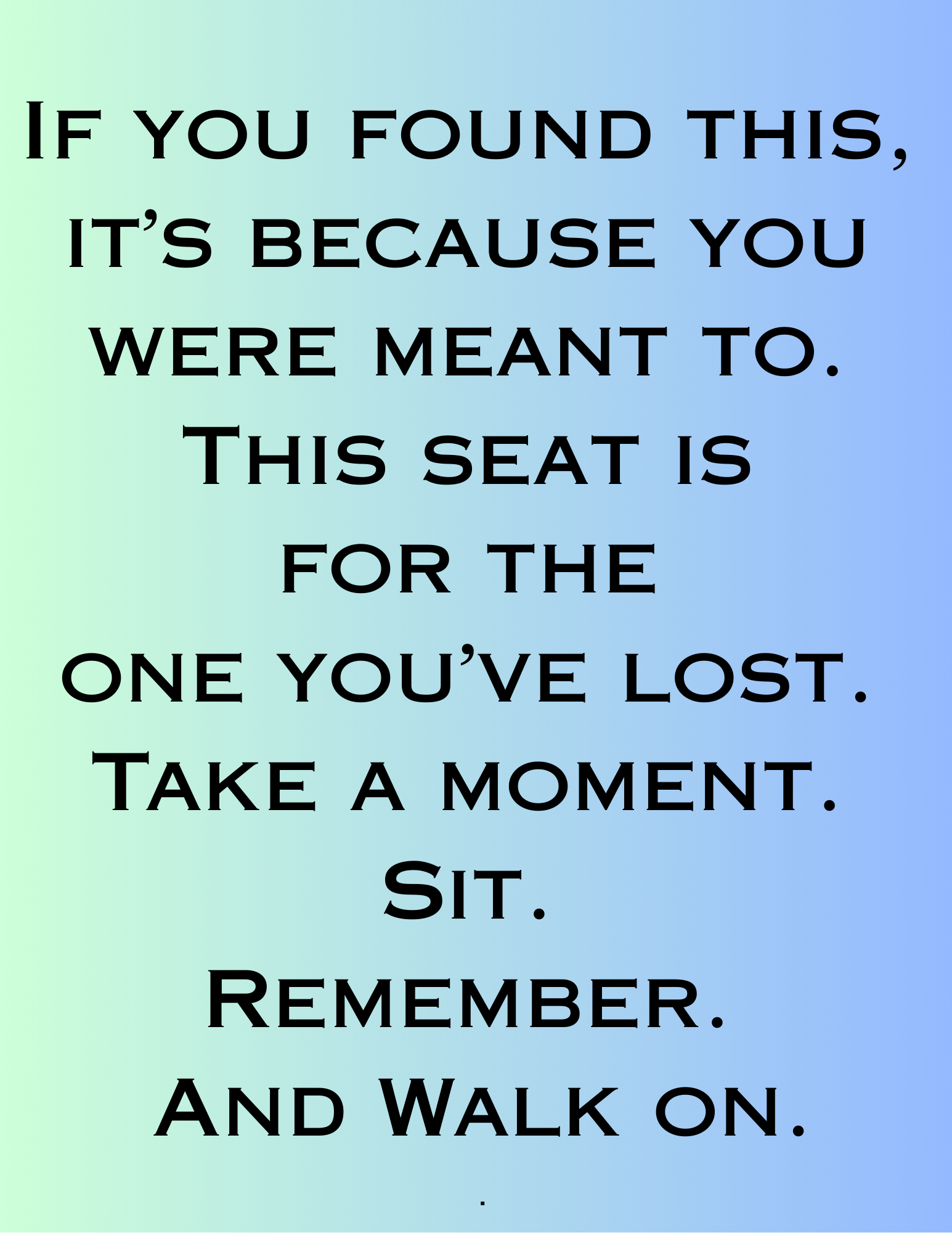 The Open Chair Movement is a dynamic reminder of the loved ones we carry in our hearts. No matter where you are, simply look for an open chair and place the card upon the open chair in your city, town, village, school, hospital, church, community center, town square, park bench, bus, subway, airport, library or any other place you might encounter an empty, open chair and allow the message on the card to compel people to sit, to remember someone who they loved deeply, to honor her or him with a quiet, reflective moment or prayer, and then to walk on and pass the card on to another empty, open chair for another human to experience it.